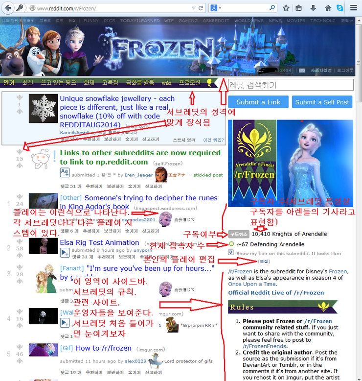 그럼 겨울왕국 서브레딧을 예시로 서브레딧 화면이 어떻게 생겼나 한번 보자.