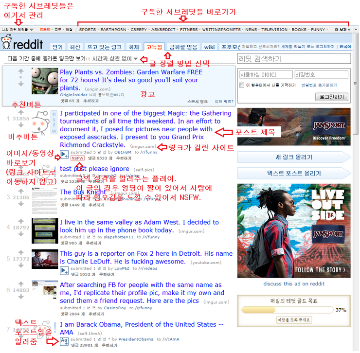 가입하면 funny, askreddit, iama, today i learned, 등 몇개의 기본적인 서브레딧에 구독되어있을것이다.