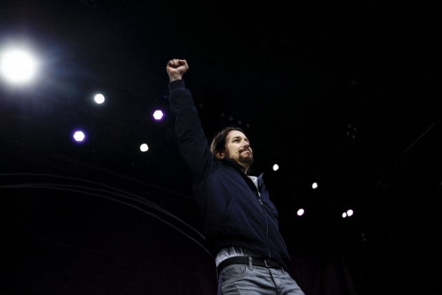 ▲ 파블로 이글레시아스 포데모스 대표는 1월 31일(현지 시간) 스페인 마드리스에서 열린 '변화를 위한 행진'에서 "변화의 바람이 유럽에 불기 시작했다"고 연설했다. ⓒAP=연합뉴스